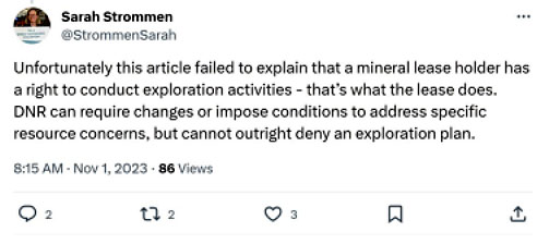 In 2023, DNR approved Franconia’s prior application for nonferrous mineral exploration in a similar location. After local media criticized that approval, DNR Commissioner Strommen issued a social media post stating that DNR has no discretion to deny an exploration request: