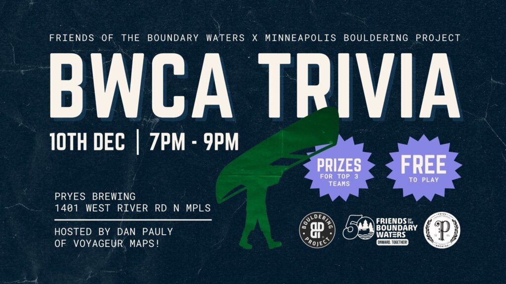 Join us for Boundary Waters Trivia Night, hosted in collaboration with Minneapolis Bouldering Project. BWCA author and Voyageur Maps owner Dan Pauly will lead the evening. Trivia is free, no team is required, and prizes go to the top three teams. Everyone is welcome, whether you climb, paddle, or just enjoy a good brew. Ready to talk about what rock routes and canoe routes have in common?